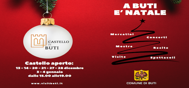 Nella giornata di sabato 20, alle ore 10.30 ecco ‘Un Albero in Comune’, l’addobbo dell’albero di Natale con i bambini presso il palazzo comunale a cura del Polo 0-6. Alle ore 15.30 (stesso appuntamento anche domenica 21) è in programma la visita guidata gratuita al Castello di Buti, alla Pieve romanica di San Francesco, al Frantoio Rossoni e mercatini di Natale (partenza da piazza Garibaldi con degustazioni presso i banchi dei produttori butesi; per prenotazioni 335.6857855). A seguire, presso le Logge di piazza Garibaldi (ore 16) ‘Fiabe di Natale’, la lettura animata per bambini a cura di Bubamara teatro, alle 16.30 il ‘Concerto di Natale’ della Corale Santa Cecilia e dalle ore 19 ‘Aperitivo in piazza’.