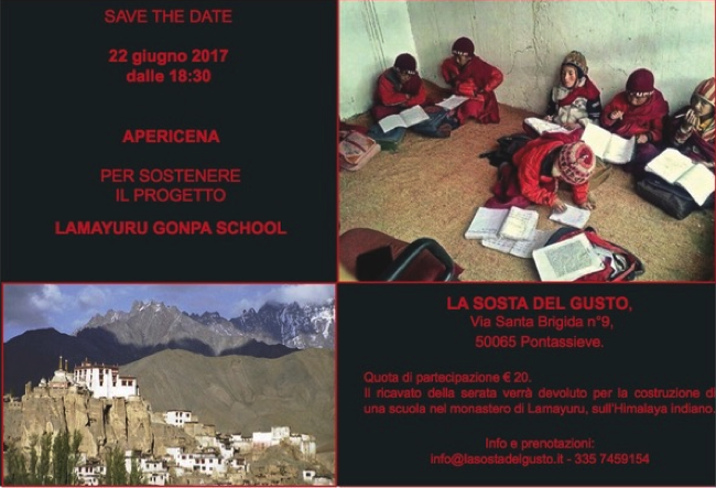 Apericena al ristorante La Sosta del Gusto (Via S. Brigida, 50065, Pontassieve, Firenze), appuntamento alle 18.30. Parte del ricavato della serata verrà devoluto per la costruzione di una scuola presso il monastero Lamayuru, sull’Himalaya indiano (il progetto è attivo da alcuni anni ed è giunto praticamente al termine: si stanno ultimando i lavori di rifinitura della struttura).