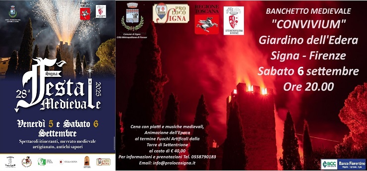 Venerdì 5 e sabato 6 settembre 2025, Signa torna indietro nel tempo con la Festa Medievale, arrivata alla sua 28ª edizione. Dalle ore 19.00 alle 24.00 le vie del borgo si animeranno con cortei storici, spettacoli teatrali, musici, giocolieri, trampolieri, antichi mestieri e giochi medievali, mentre nei banchi gastronomici si potranno gustare piatti ispirati alla cucina dell’epoca. Il venerdì sera sarà possibile assistere al Corteo Storico di Signa e al Palio degli Arcieri. L’ingresso è libero e gratuito.