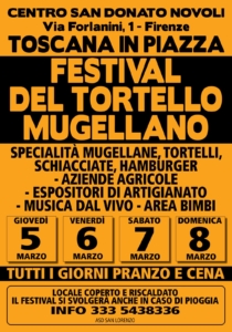 Al Centro San Donato di Novoli (via Forlanini) Toscana in Piazza presenta il Festival del Tortello Mugellano nei giorni 5, 6, 7 e 8 marzo. L’evento celebra uno dei piatti più iconici della cucina mugellana: il tortello fatto a mano, ripieno di ricotta e verdure e condito con burro e salvia o ragù locale. Si potranno degustare specialità mugellane, ottimi tortelli, buonissime schiacciate ed hamburger sfiziosi. Saranno presenti diverse aziende agricole del territorio ed espositori d’artigianato. Non mancherà la musica dal vivo per arricchire il programma festoso della 4 giorni, e ci sarà un’area dedicata ai bimbi dove potranno giocare e divertirsi in sicurezza. Il festival valorizza le tradizioni toscane promuovendo prodotti tipici, vini del territorio e momenti di intrattenimento per famiglie e visitatori. Tutti i giorni pranzo e cena. Il festival si svolge anche in caso di pioggia.