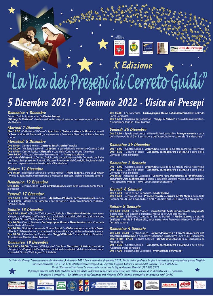 Nata dall’impegno dell’intera comunità cerretese, La Via dei Presepi giunge quest’anno alla decime edizione e presenta numerosi presepi, allestiti nelle strade del centro storico di Cerreto Guidi.