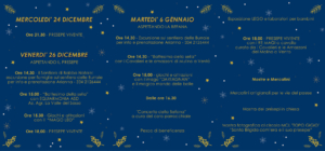 Ma nel programma sono presenti molti altri appuntamenti, come i mercatini artigianali per le vie del paese, la mostra dei presepi in chiesa e la mostra fotografica al Circolo Mcl ‘Topo Gigio’ dal titolo ‘Santa Brigida com’era e il suo presepe’. Inoltre venerdì 26 dicembre, aspettando il presepe vivente, ecco ‘Il sentiero di Babbo Natale’, escursione per famiglie sul sentiero delle Burraie (ore 14.30), il ‘Battesimo della sella’ con Equiarmonia Asd’ (ore 15) e giochi e attrazioni con il Mago Leo (ore 15.30). Martedì 6 gennaio, tra gli altri, dalle ore 16.30 il ‘Concerto della Befana’ a cura del coro parrocchiale, la pesca di beneficienza, oltre a un’esposizione Lego e laboratori per bambini.