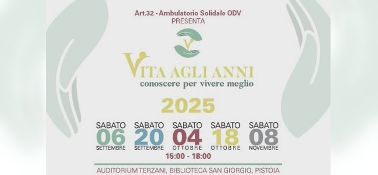 Pomeriggi per parlare di prevenzione, stili di vita e benessere insieme a medici e professionisti della salute grazie ad Art.32 – Ambulatorio Solidale ODV con il coordinamento scientifico della geriatra Alessandra Pratesi. Sabato 4 ottobre è riservato alle malattie oncologiche e neurodegenerative, con interventi su demenza, tumori e cure palliative, mentre sabato 18 ottobre sarà la volta delle patologie cardio-cerebro-vascolari, con un focus su infarto, ictus e scompenso cardiaco. Gli incontri si tengono sempre dalle 15 alle 18 nella Biblioteca San Giorgio di Pistoia.